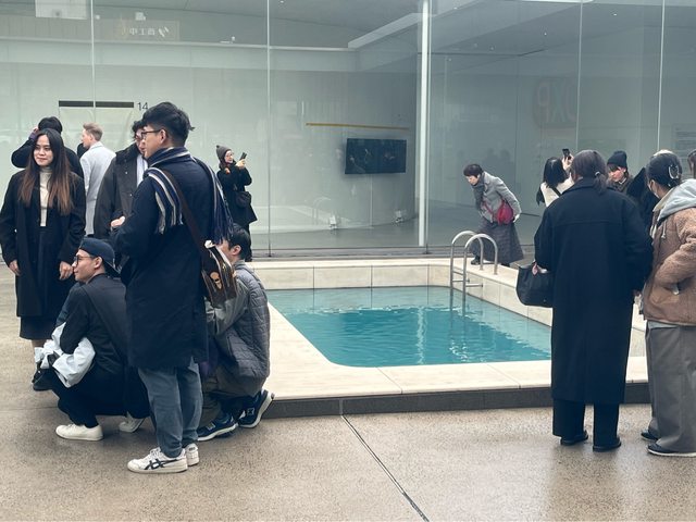 著名的游泳池作品,圍繞不少參觀人潮,或與作品合影、或欲一探究竟。