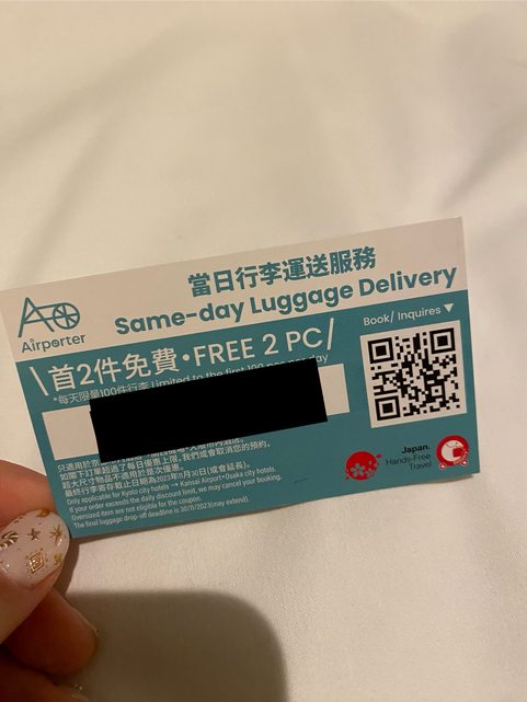 這次入住的飯店剛好有發行李當日配送服務的優惠碼