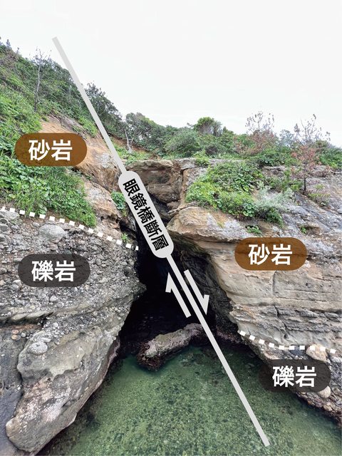 最底下的礫岩層,因斷層的作用相對抬升而露出地表。斷層線則因相對易受侵蝕,形成海