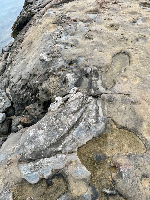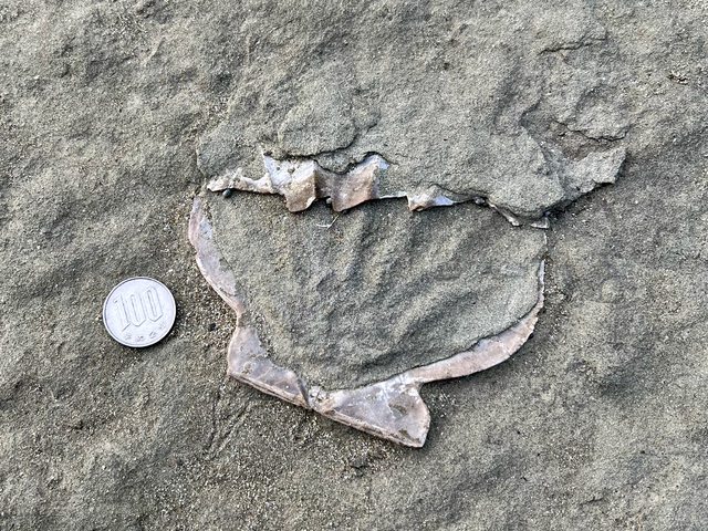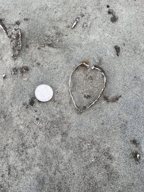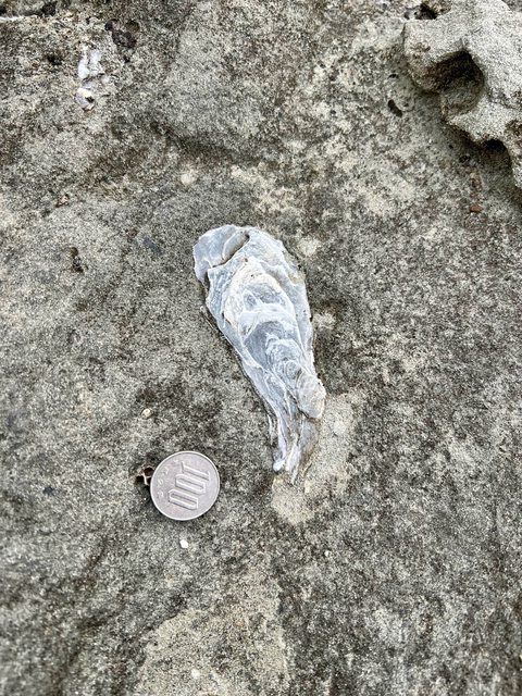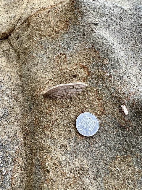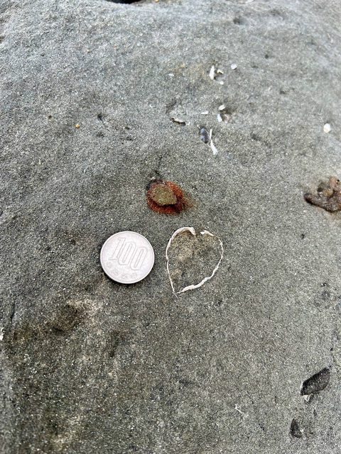 除了普通的貝類化石,在千疊敷上也能找到許多橫斷面的貝類化石,外型像是一顆愛心一