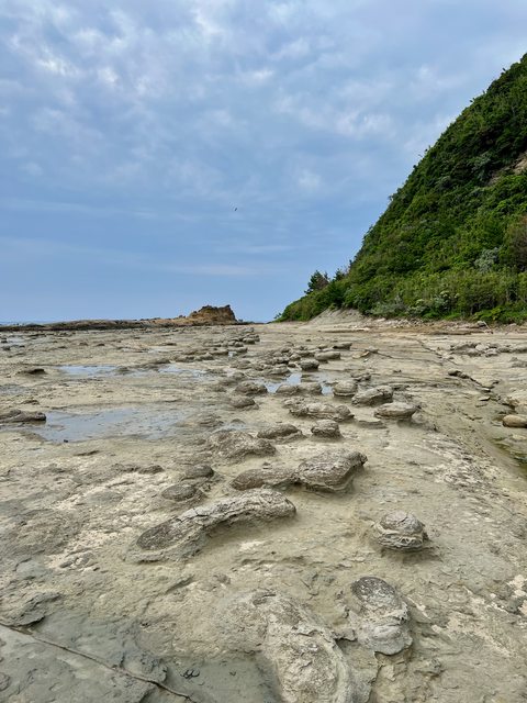 千疊敷上除了縱橫交錯的節理,也能發現許多直徑20~30公分,渾圓的球狀岩塊。