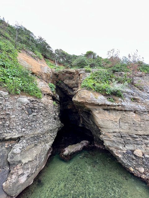 鏡橋這邊的斷層露頭形成了海蝕洞。