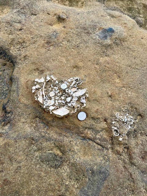 這些球形岩塊是「結核」。貝類等化石中滲出的碳酸鈣等物質,使化石周圍的砂岩變得特