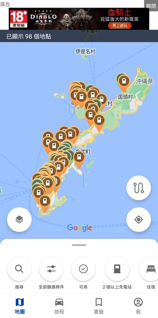Day 1 OTS > 泡瀨漁港 > 名護鳳梨園 > AEON 名護店 > 本部飯店 約110公里 電剩73