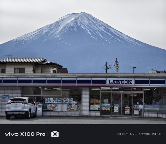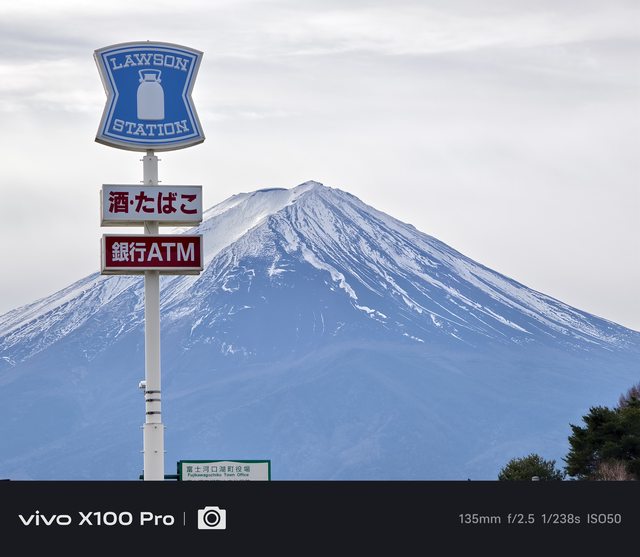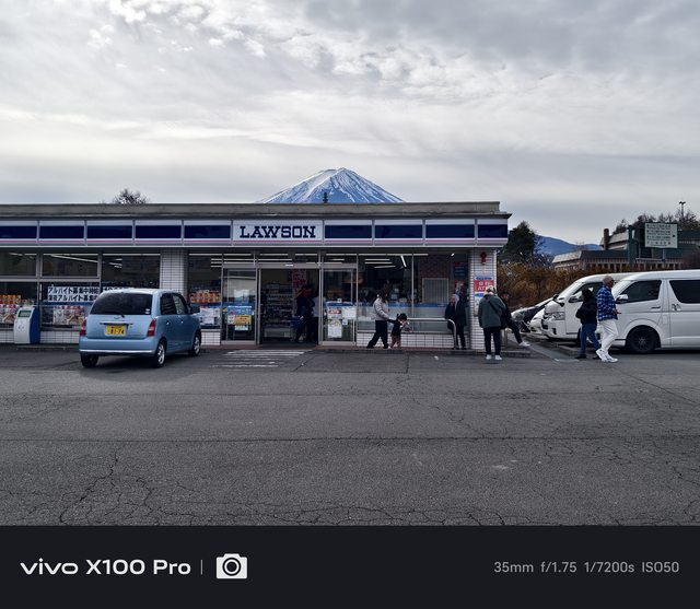 善用手機長焦,跑到馬路對側的人行道,就可以拍出Lawson跟完整富士山入鏡