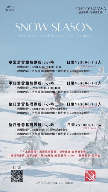 內 容: 3/6-3/7會前往越後湯澤滑雪,教練是波賽頓的阿咪教練,上課方案每日5小時,中間休息1小時,一個教練最多帶4位學員,希望有人可以一起當分母。
