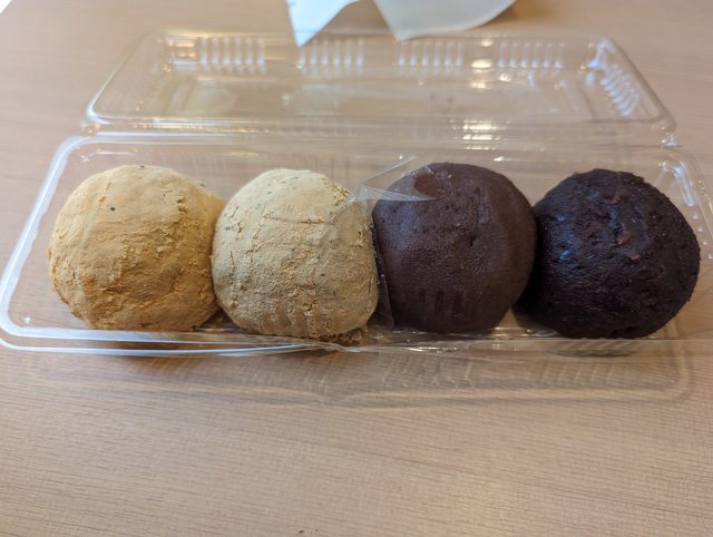 順利買到四個,兩個黃豆粉,紅豆顆粒跟紅豆泥各一。黃豆粉的是米飯裹著紅豆餡,外面