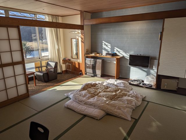 有些溫泉飯店會在住客吃晚餐的時間進房舖被子,但這邊是事先舖好的