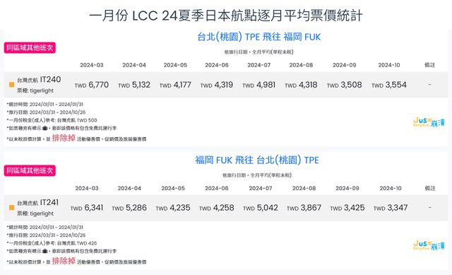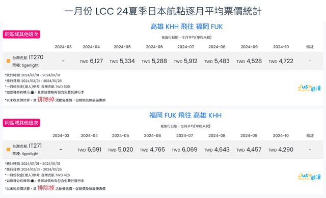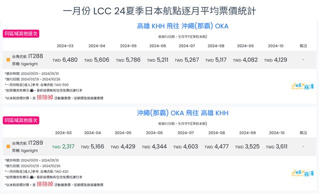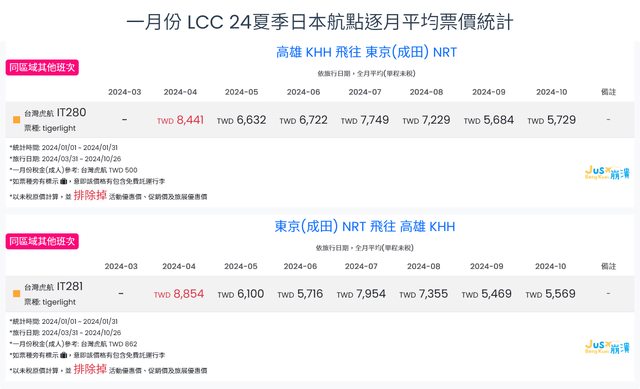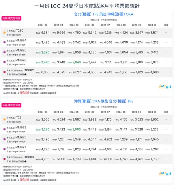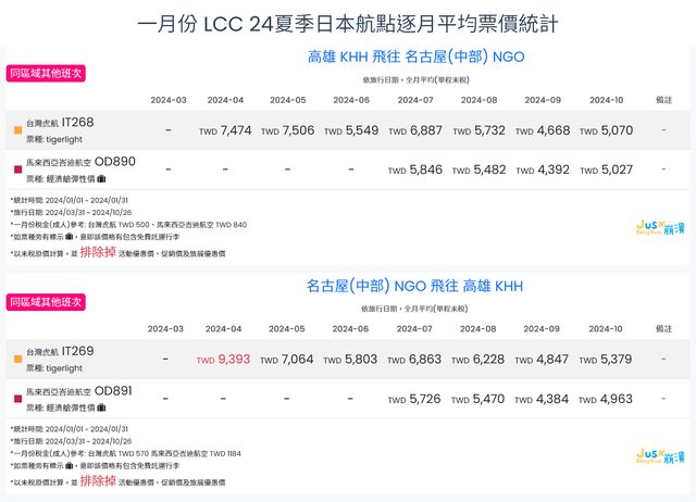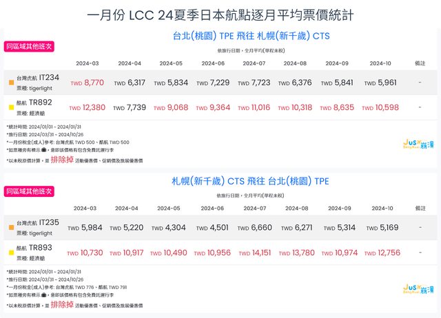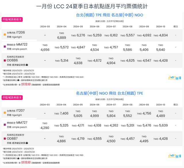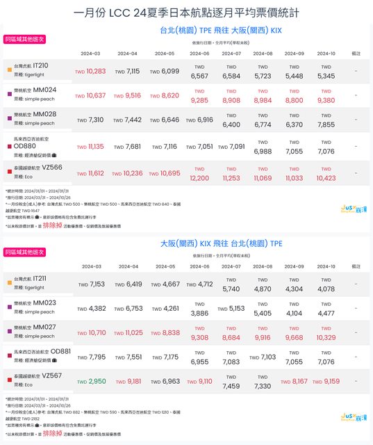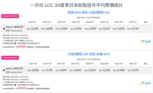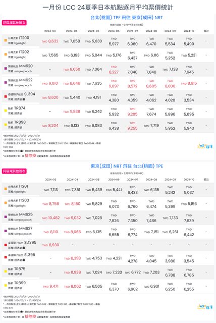 標題[分享] 1月LCC 24夏日本航點逐月均價統計