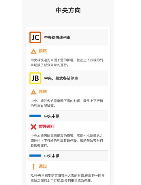 → wcc960 : 中央本線 高尾-富士見間停駛 預定中午才會恢復 02/06 04:42