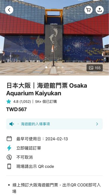 標題[讓售] 大阪海遊館電子票券2張(2/14 15:15)