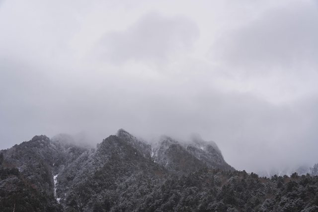 下雪中的大正池與遠方繚繞於山頂的雲,形成一片陰鬱的美景。