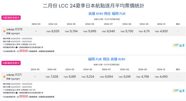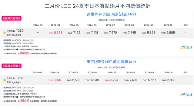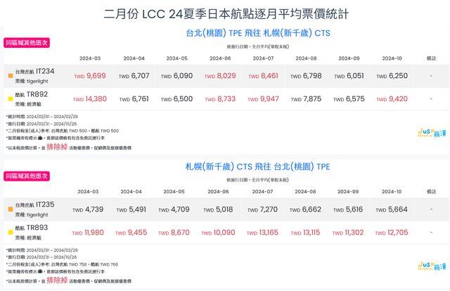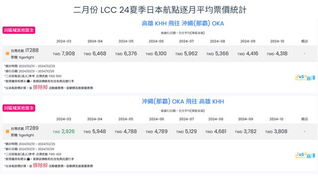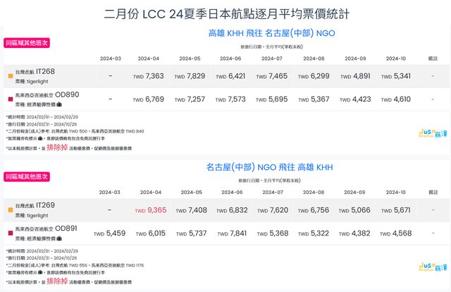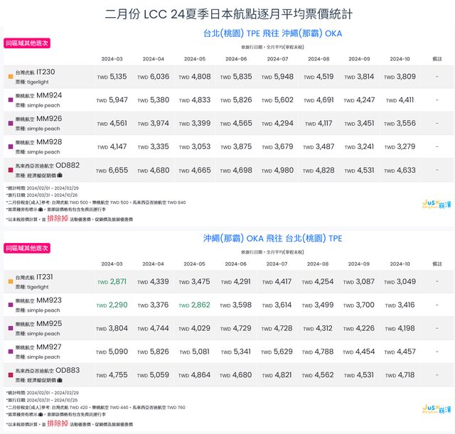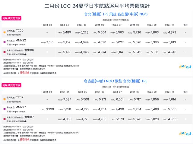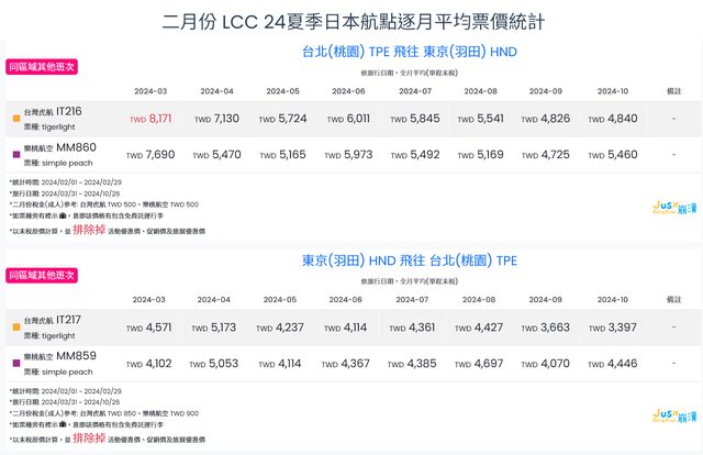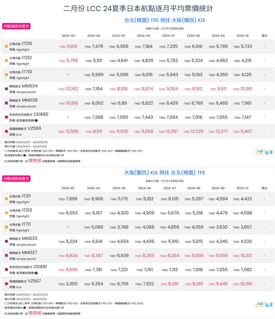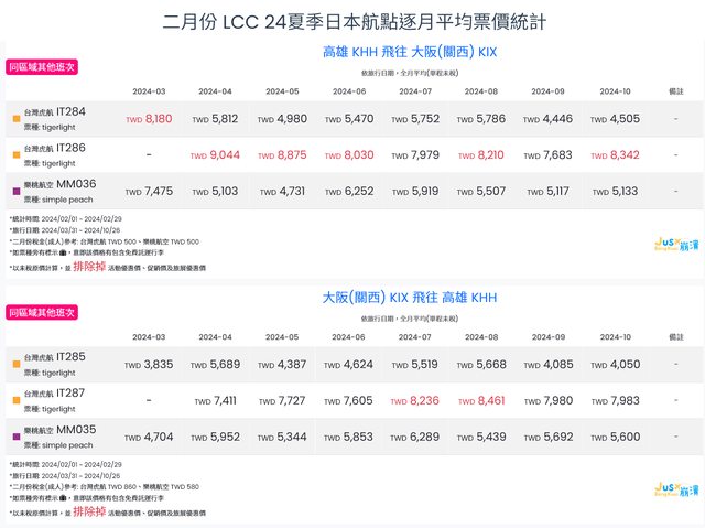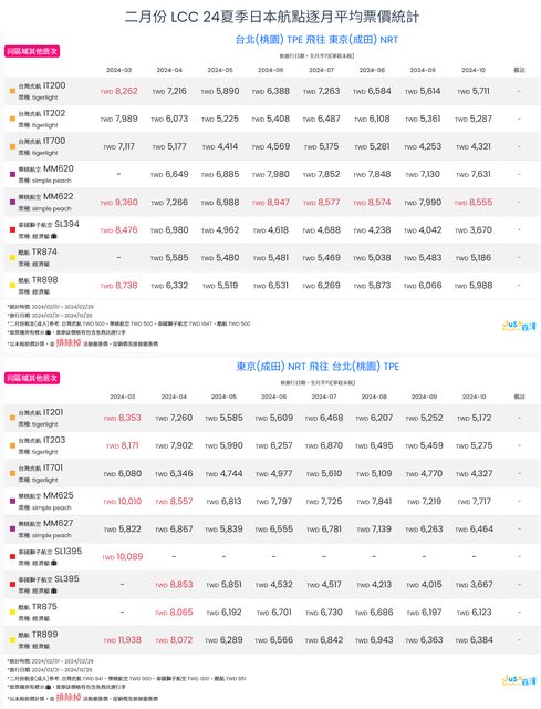 標題[分享] 2月LCC 24夏日本航點逐月均價統計