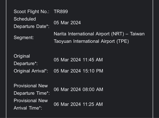 推 th2113 : TR899改20:05成田飛台北,TR899改0:30台北飛新加坡03/05 15:44