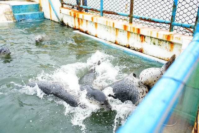 豹,眾多海豹中有兩隻會拍打水面,像是要你趕快餵我一般,十分有趣,另一邊小池子有