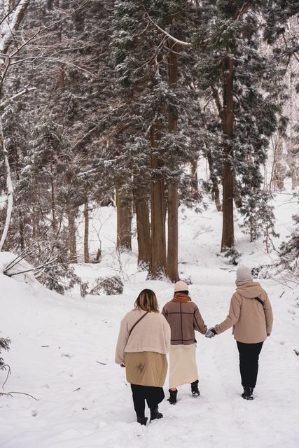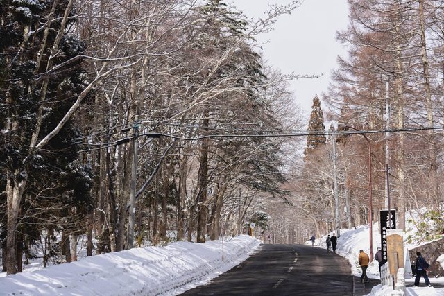 己的雪鞋,因此參觀完中社後選擇走車道前往奧社,沿路兩旁的樹林茂密,雪地時不時會