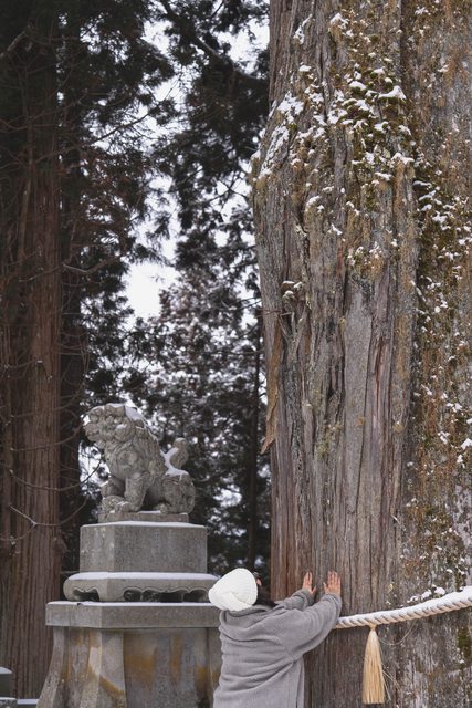 戶隱中社已經有幾株 800 年的巨木,參拜的人們會把手放在巨木上祈禱。