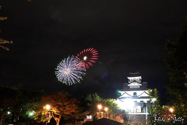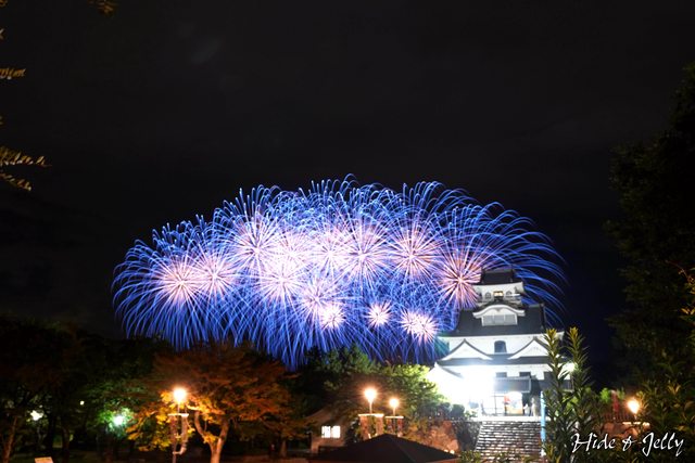 這藍色的連續花火,更是前10分鐘的高潮,搭配天守絕對是很難得的畫面。而花火的爆炸