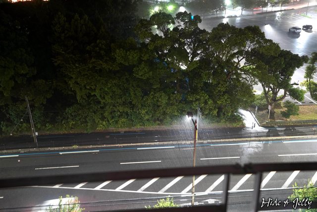 ,趕緊在天守前合影完後,快步回到飯店。上樓進房間後,看到窗外居然開始下著傾盆大