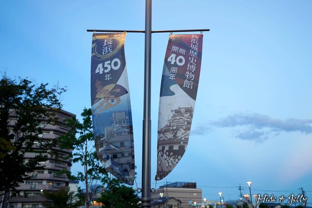 長浜城內還掛著長浜450周年與長浜城歷史博物館40周年的旗幟。
