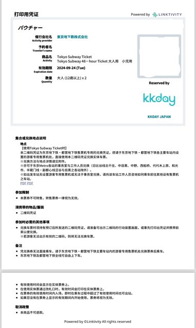 1. 讓售品項:東京地鐵二日券 48H*2