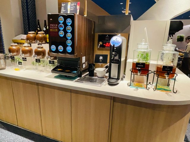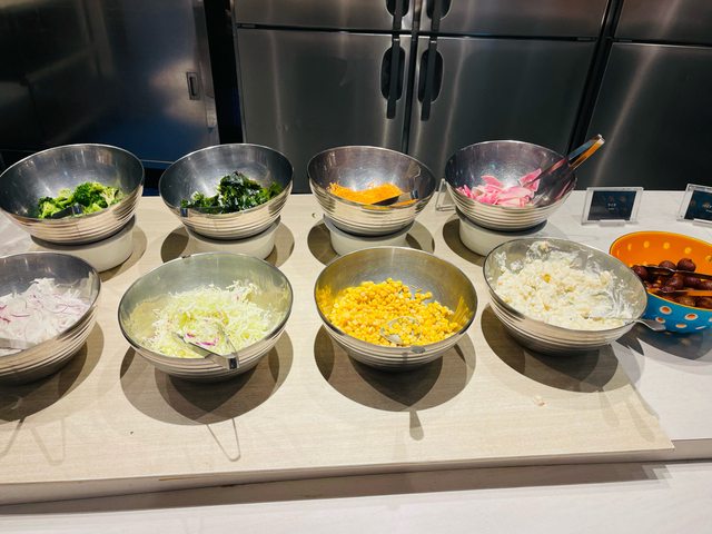隔天早餐,蛋、蛋卷、米飯、咖喱、德式香腸、火腿、各式麵包、玉米濃湯、味噌湯、小