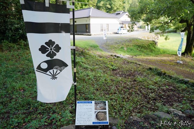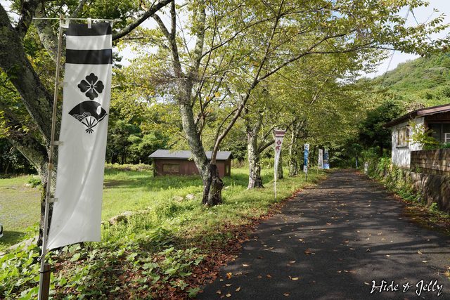 一旁有小徑可以通往歷史資料館,一旁的軍旗上是国吉城主栗屋勝久的家紋「花菱に扇」