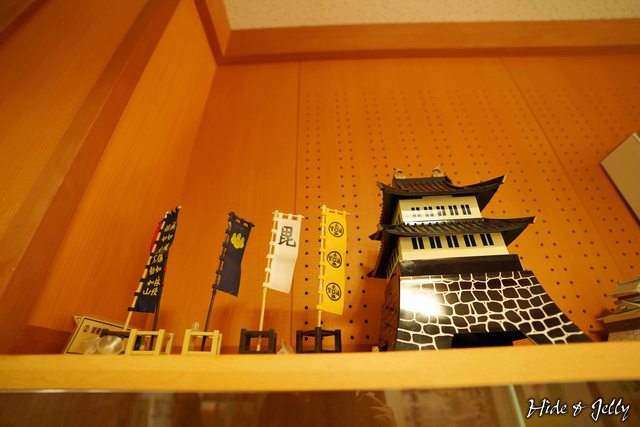 在不知道哪一座城的櫓模型旁,還有織田信長、上杉謙信、豐臣秀吉、武田信玄等的軍旗
