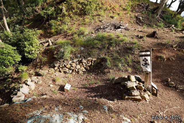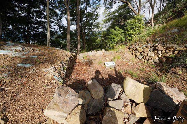 繼續往上爬,樹木變少了,太陽可以照射到,就代表本丸的山頂快到了。這裡有一處石垣