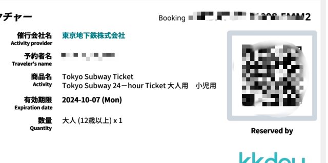 東京地鐵一日券24hr QRcode*1 (2024/10/06前各地鐵站兌換)
