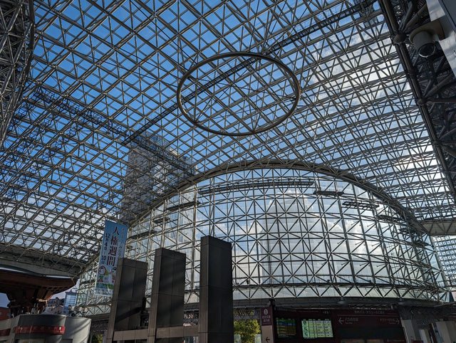 門位於金澤站的東口,是以日本傳統小鼓為藍本的巨大木製構造。後方的玻璃圓頂則是因