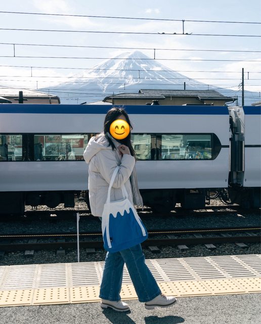 (3) 這次特別帶了富士山帆布包作為拍照道具,一到河口湖車站就在月台拍了好久~