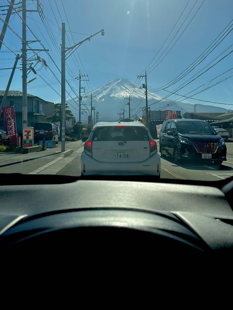 這處也是較少人推薦的點「金鳥居」,在路口巨大的鳥居剛好框住富士山,當時已經接近黃昏,昏暗的街道,從高處的車流不斷穿越金鳥居開往市區,每年8月底這條街道還有祭典活動「吉田火祭」。
