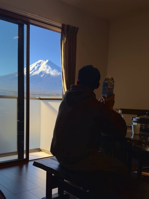 這次住的民宿,特別挑選可以在陽台就看到富士山的房型,早上6點左右隨著太陽漸漸展出頭,富士山頭的雪白也慢慢的染紅了一半,在這短短幾分鐘太陽升起的過程,富士山光影的變化真的超美的!此刻讓我有決定了,下次要到山頭看看所謂的富士山御來光。
