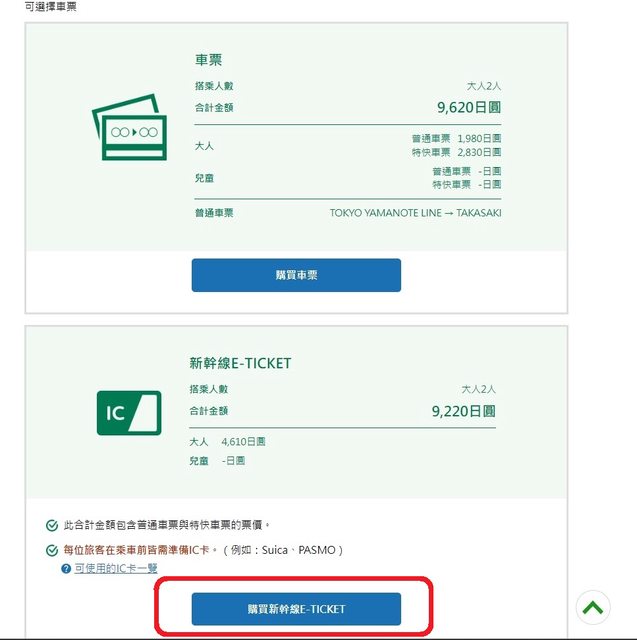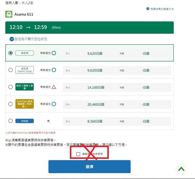 : 要使用新幹線E-TICKET,就不能勾選「僅購買特快車票等」
