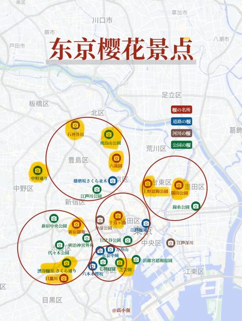 留一個多小時,然後在兩日內走訪了總共12個賞櫻點(如下圖螢光標記)。