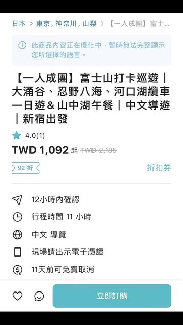 6月初預計去東京獨旅,其中有一天想參加kkday 富士山的行程,看到官網有兩人報名買一?