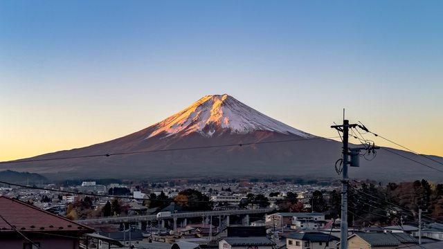 - 攝於當時住的民宿,清晨起床,發覺到山頭覆雪的富士山如此靠近!