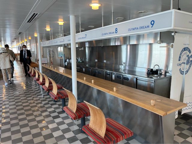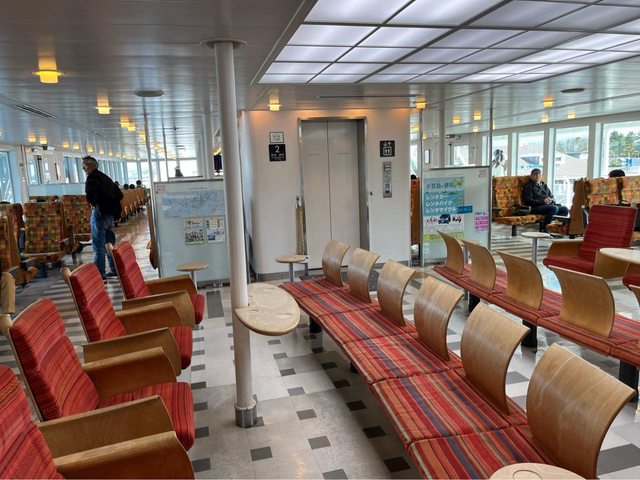 這趟航程約70分鐘,不過船上的餐飲部沒有營業;我們有在岡山駅買山田村的飯糰及昨天