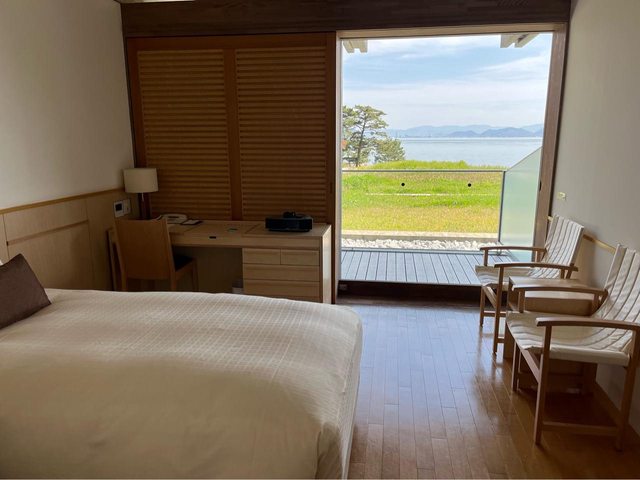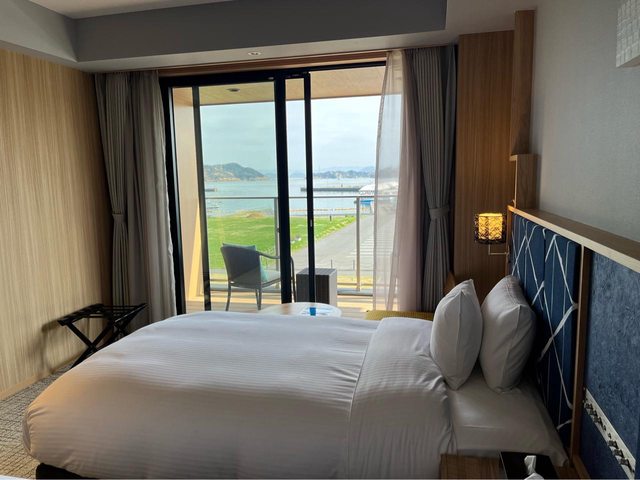 Check in時,是一位在日本工作的台灣人-傅小姐(Fu)詳細幫我們介紹飯店設施,我們 也詢問她推薦的餐廳,她建議飯店的西餐或溫泉會館的日式料理。 飯店還蠻新的(2021開幕),一泊一食32,480円。有陽台、海景,可以直接看到直島。