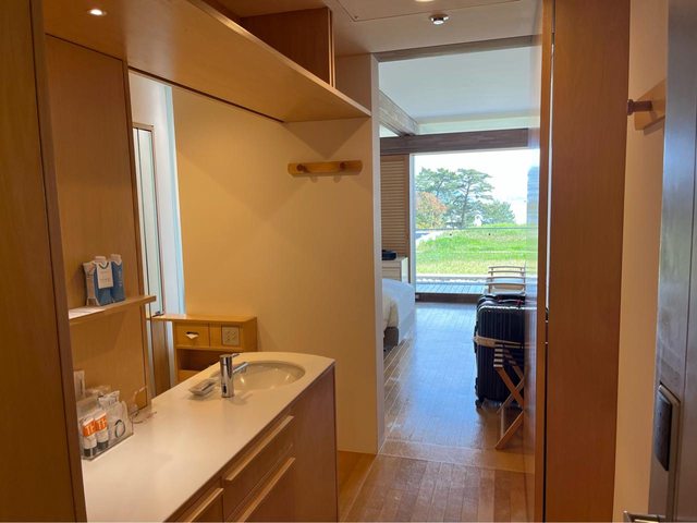 參觀完,搭14:07接駁車進去飯店。這是這趟旅程最貴的房價(素泊、54,395円),不過 有含倍樂生美術館門票(1,300円)及接駁費用,也可以進入咖啡廳享用簡單的午茶時光 。