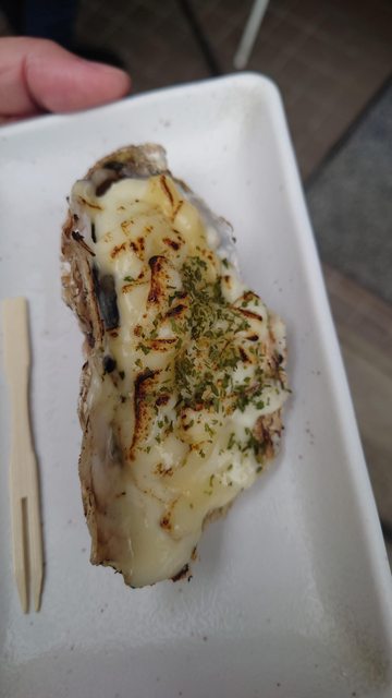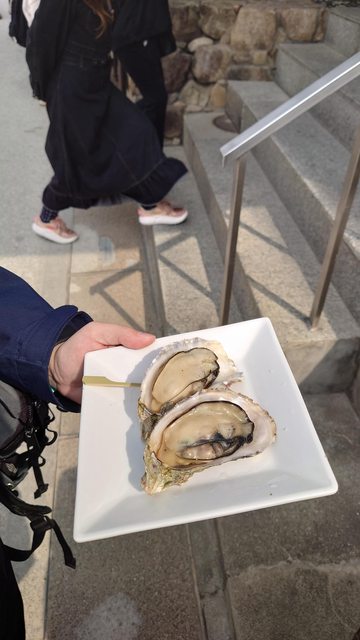 沿著海邊的參道朝神社,順便買了烤牡蠣跟炸牡蠣麵包來吃,牡蠣好好吃啊!