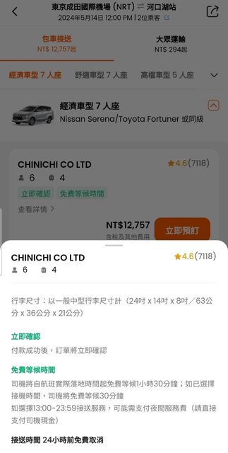 有人跟我同班機又剛好要去河口湖站,可以一起共乘,Klock費用12757台幣,經濟7人座