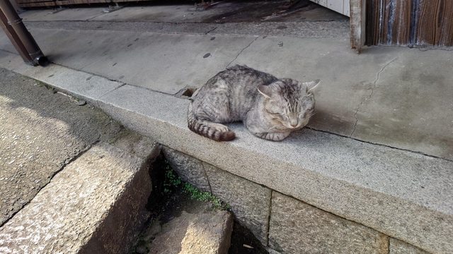 趕緊拿出相機拍,有一隻在打瞌睡的灰色班貓不怕人,自顧自睡的任你摸。