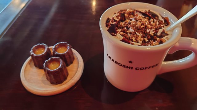 就進去喝杯咖啡歇息一下,肚子也有點小餓,點了巧克力咖啡跟迷你可麗露來吃。