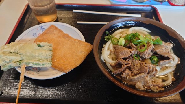 我點了肉烏龍麵(湯),再選豆皮跟炸碗豆做配菜。