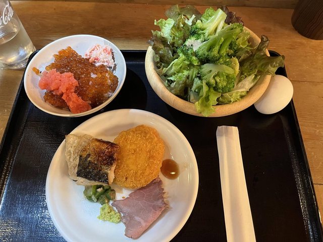 基本的品項都有,生菜、味噌湯、咖喱飯、牛奶、漬物、納豆、鯖魚…等等