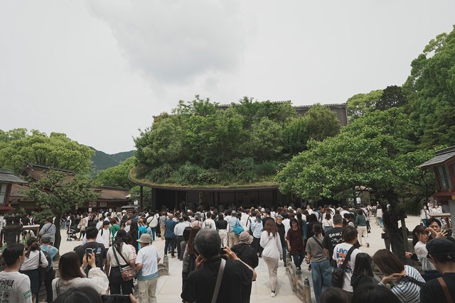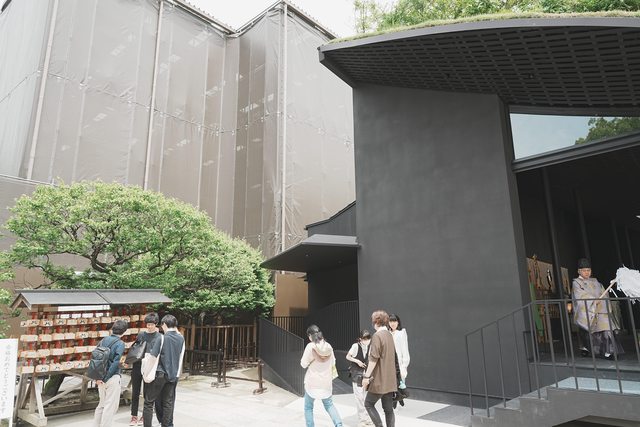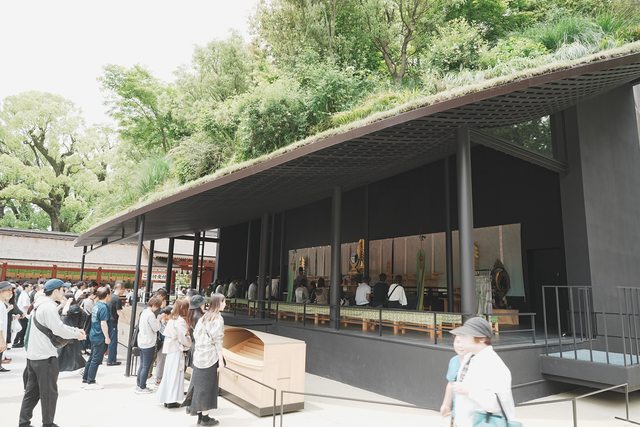 將神社境內的植物種在屋頂上,綠意盎然的臨時本殿和多到嚇人的人潮形成強烈對比