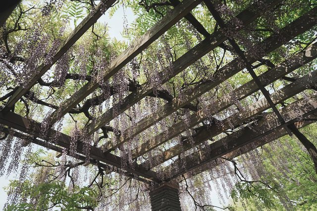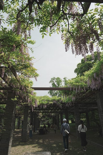 話是這麼說,紫藤依舊很漂亮,不少人坐在藤架底下的椅子上欣賞,頗為風雅
