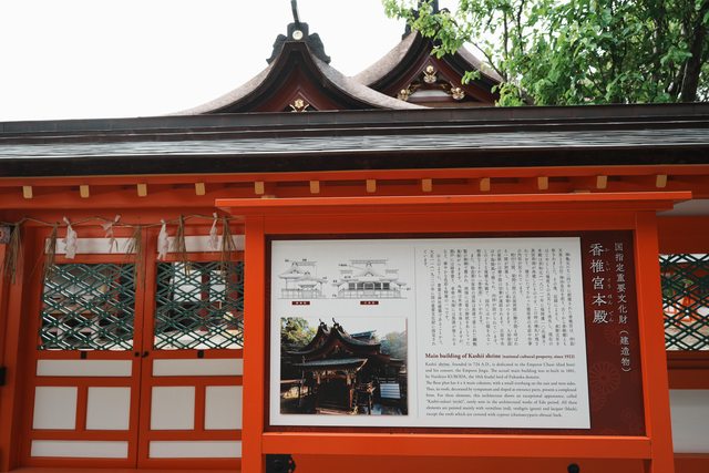 本殿被列入指定重要文化財產,其獨特的香椎造是日本唯一